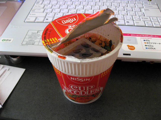 お湯を入れて3分待った麺にトッピング。混ぜ混ぜして啜ると、やはり超激辛でした!