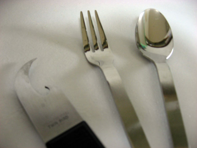 フォークとスプーンもぴったりと重ね合わせられるデザインのもの。多分無印良品だったと思います。