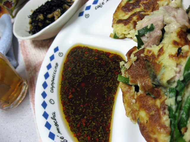 サラダ油と醤油とペペロンチーノの香辛料と砂糖を混ぜたら、見事にチヂミのたれっぽくなりました^^